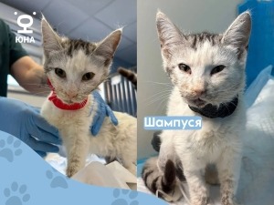 По счастливой случайности кошечку нашел хозяин нашего бывшего подопечного, он сразу привез малышку в Центр «Юна». Сейчас Шампуся в безопасности, под наблюдением врачей, но впереди у нее долгий и сложный путь к восстановлению.